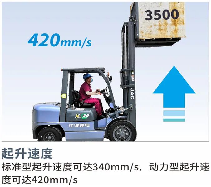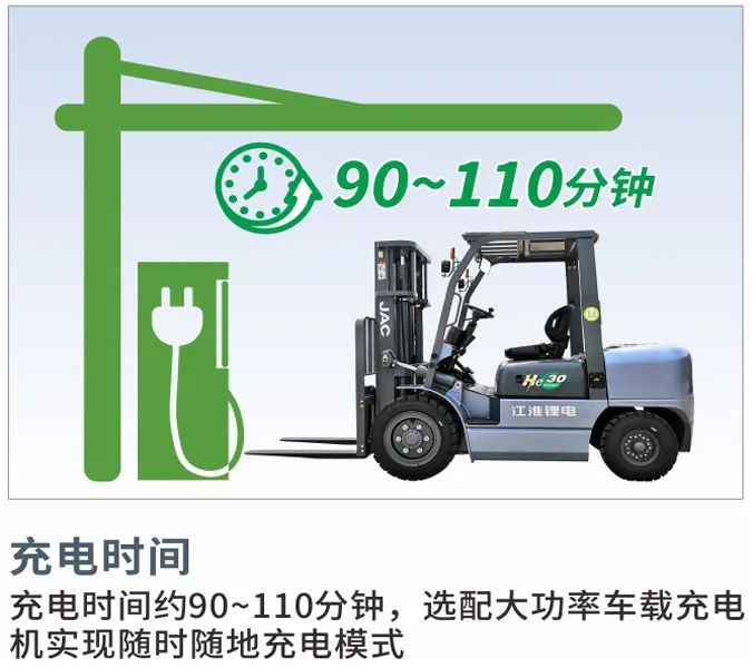 10%-100%充电时间约90—110分钟,可随用随充,满足多频次多班次作业需求;满载行驶速度可达20公里/时,缩短行驶耗时,提升工作效率;电池5年或10000小时超长质保(先到为准),大幅度降低综合使用成本,让您安心无忧使用。