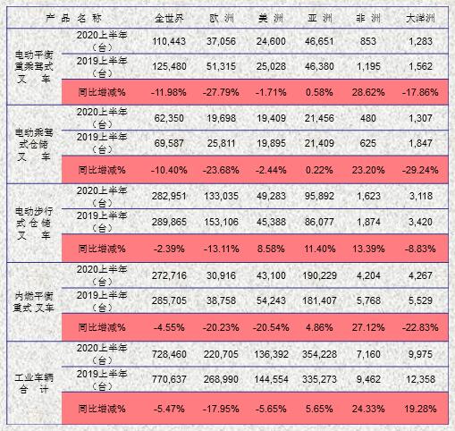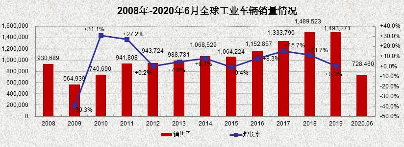 2009-2019年全球销售保持了稳步增长,2020年受新冠疫情影响,工业车辆的需求量同步减少,全球经济步入新的底点,调整没有金融危机时那么大,预计全年将是负增长。