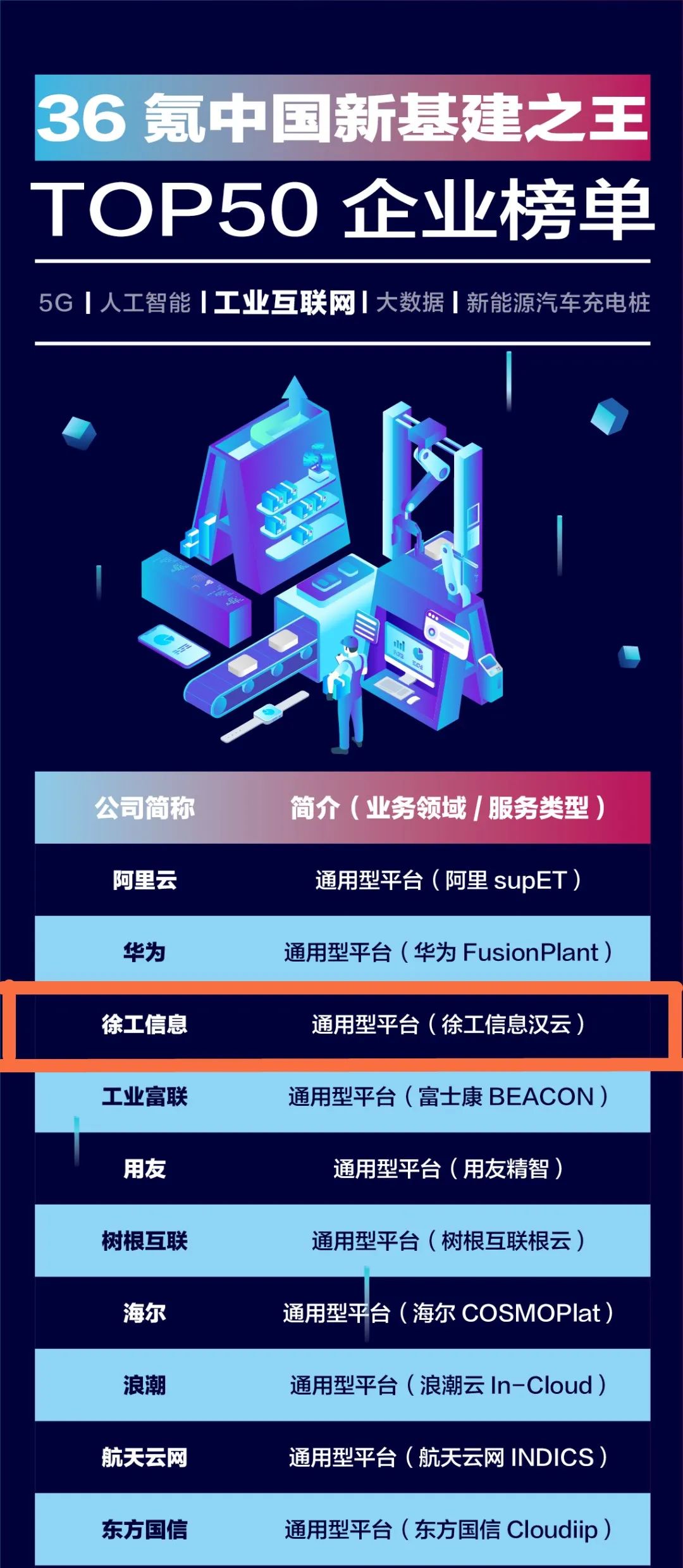 9月16日,“36氪新基建之王「工业互联网领域」TOP50企业榜单”重磅发布,徐工汉云工业互联网平台携手阿里云、华为跻身前三甲。