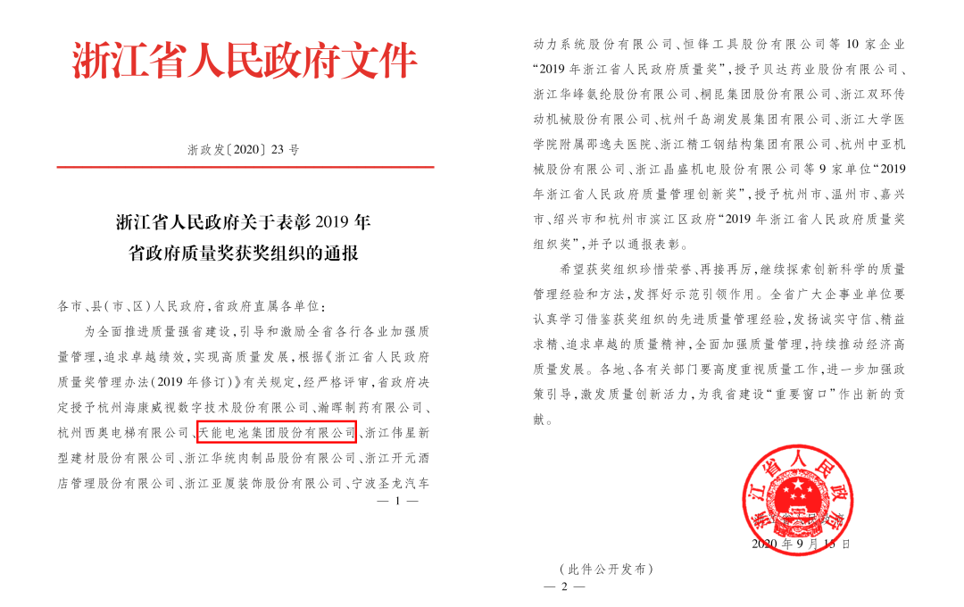 近日,2019年度浙江省政府质量奖名单发布,天能股份凭借优异的质量管理和质量创新模式,获评2019年浙江省政府质量奖。