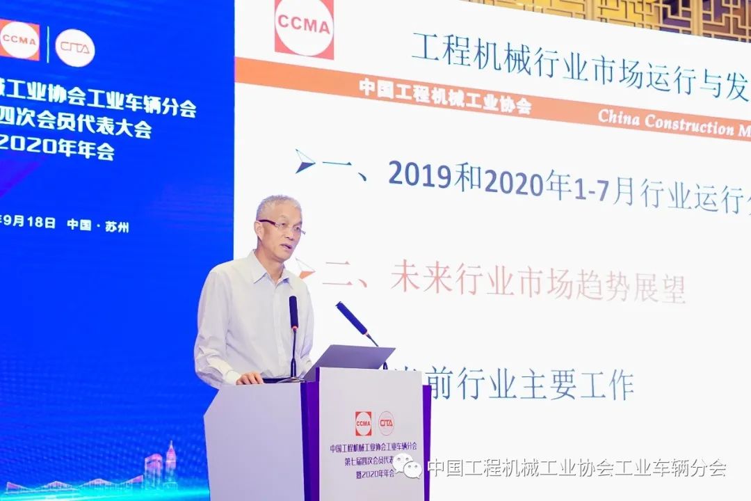 中国工程机械工业协会会长祁俊发表致辞并介绍工程机械行业形势。祁会长对2019年和2020年1-7月行业运行进行了详细分析,阐述了未来行业市场趋势展望以及当前行业的主要工作。祁会长指出,2020年1-7月销售量逐月好转,同比增长18%。由于疫情影响,改变了往年3月份为年度销量高点的惯例。3月份挖掘机、叉车、升降作业平台创历史新高,原因主要包括:全行业有序复工复产,国家、地方各项经济政策实施,行业企业根据新的市场需求创新发展。预计2020年国内工程机械市场需求会有平稳增长。今年工程机械出口由于受疫情影响,将呈现较大压力,保持增长还需付出较大努力。2021年工程机械市场需求将保持平稳发展,市场新增和更新需求将共同发挥作用。