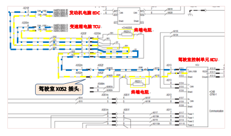 根据机车电气原理图,检查KCU到发动机和变速箱控制单元之间通讯线路,如下: