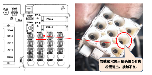 拆卸X052插头,检查发现X52/2针脚松动脱出: