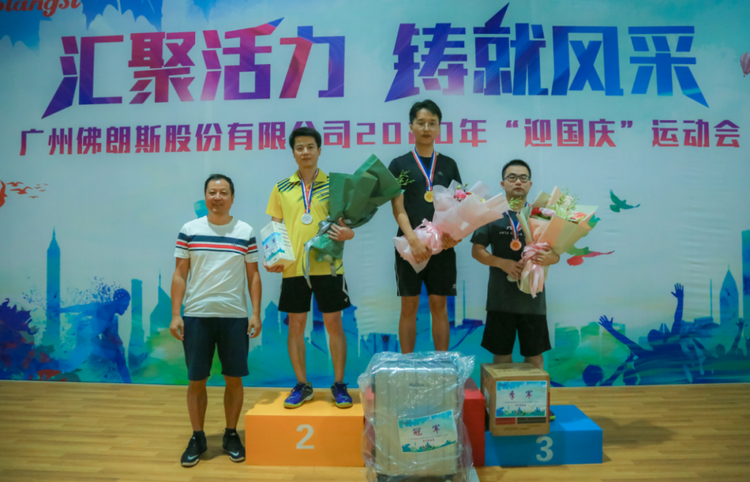(董事长侯泽宽为男单羽毛球前三名颁奖)