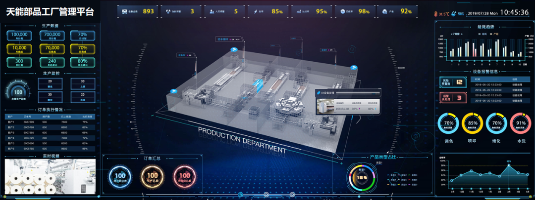 数字驾驶舱则又细分为总裁驾驶舱、营销驾驶舱、生产驾驶舱、供应链驾驶舱、厂长驾驶舱五大子驾驶舱,彼此之间分工协作,共同完成对企业全局、隔板车间、注塑车间的数据布控与集采工作。