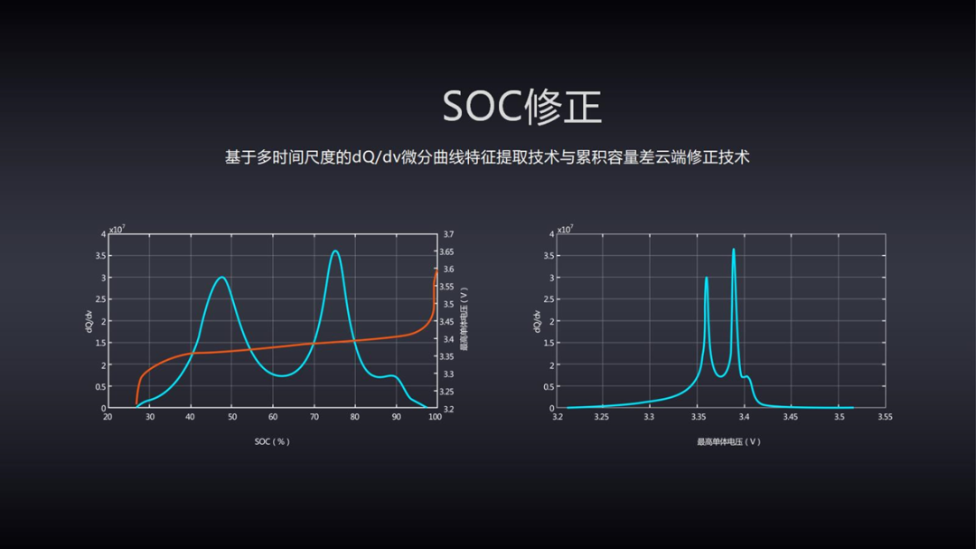 下面这个图是dQ/dV的微分曲线,我们可以看到在SOC的中段有2个波峰1个波谷的明显特征,我们就是利用这3个点进行SOC的校准,但是这个算法涉及到微分算法,且要求的数据量也比较大,嵌入式里面难以实现,所以我们将这个算法放到云端来执行。