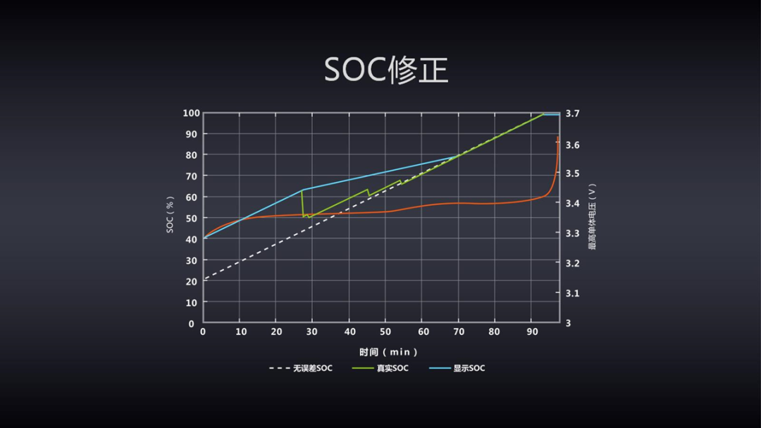 下图是我们客户在现场的实测试曲线,在电池SOC在20%时,故意将SOC调整至40%,人为引入20%的误差,大家可以看到真实SOC分别约为40%、60%、70%时,实施了3次校准,最终的SOC的误差控制在2%以内。