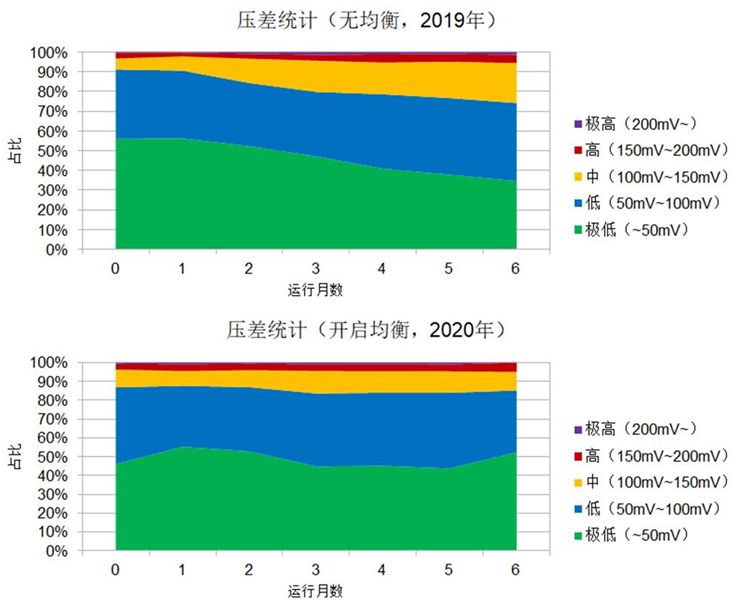 另外,我们从后台数据分析对比了一些开启远程均衡和未开启远程均衡的设备,我们挑选2019年前6月出货设备,与2020年前6月出货设备进行对比,这两组设备具有相似的样品数量和运行时间,我们最后统计出来的结果是2019年那批未开启远程均衡的设备经过一段时间运行后,压差小的设备占比减小,压差大的设备占比增加;而2020年出货的设备,压差小的设备占比反而有所上升,云端全时均衡的效果相当明显。