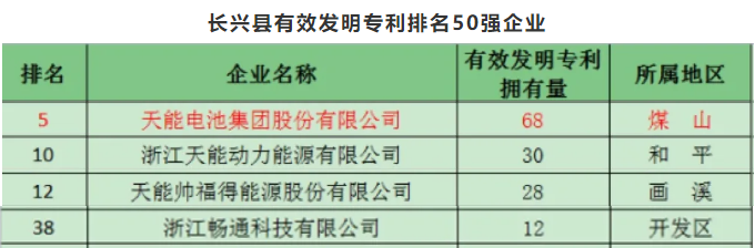 ❂【各子公司】近日,长兴县市场监管局发布县有效发明专利排名50强企业名单。煤山、动力能源、天能帅福得、畅通公司入选。