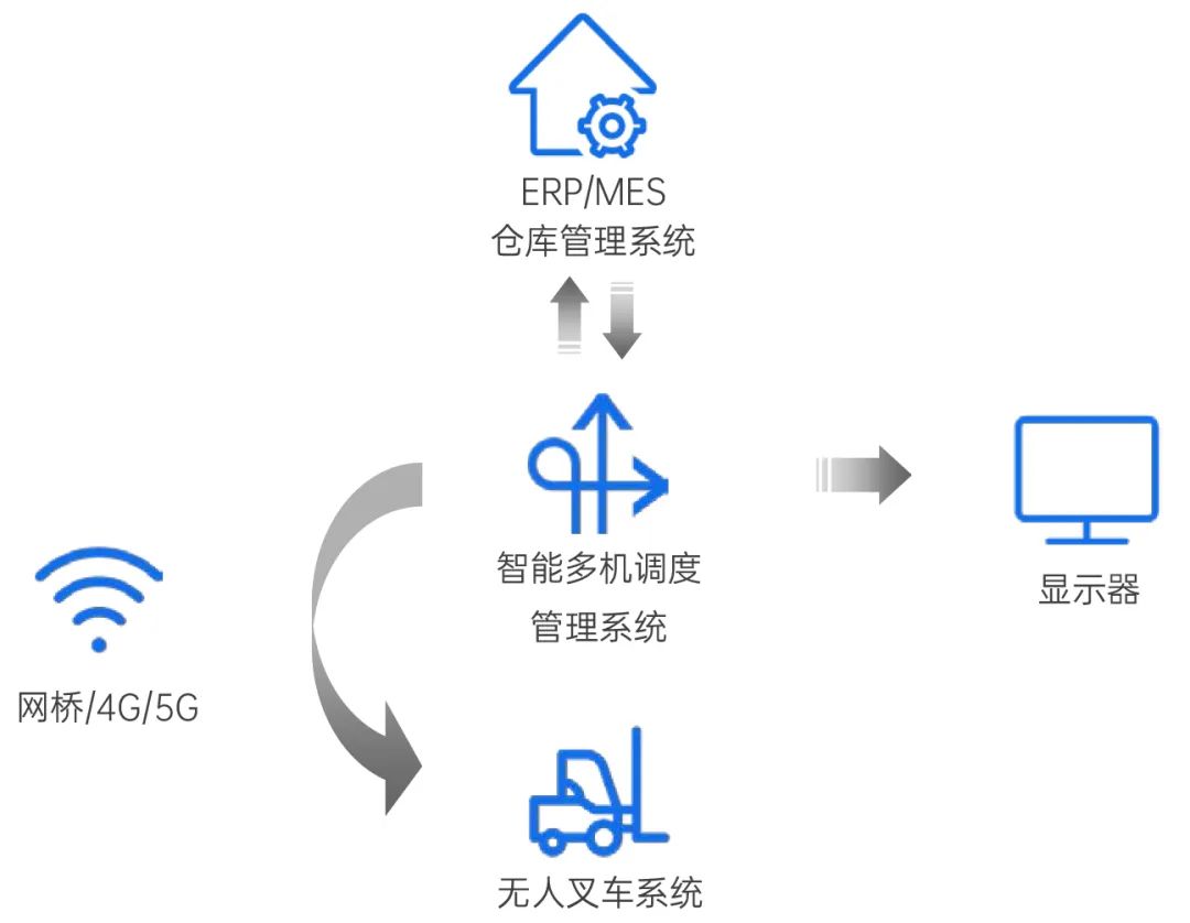 其中,智能多机调度管理系统部署在后台服务器端,负责从ERP/MES仓库管理系统获取任务,并智能分派给空闲的无人叉车。同时,系统实时监控各个叉车的运行状态,根据任务完成情况上传到仓管系统。