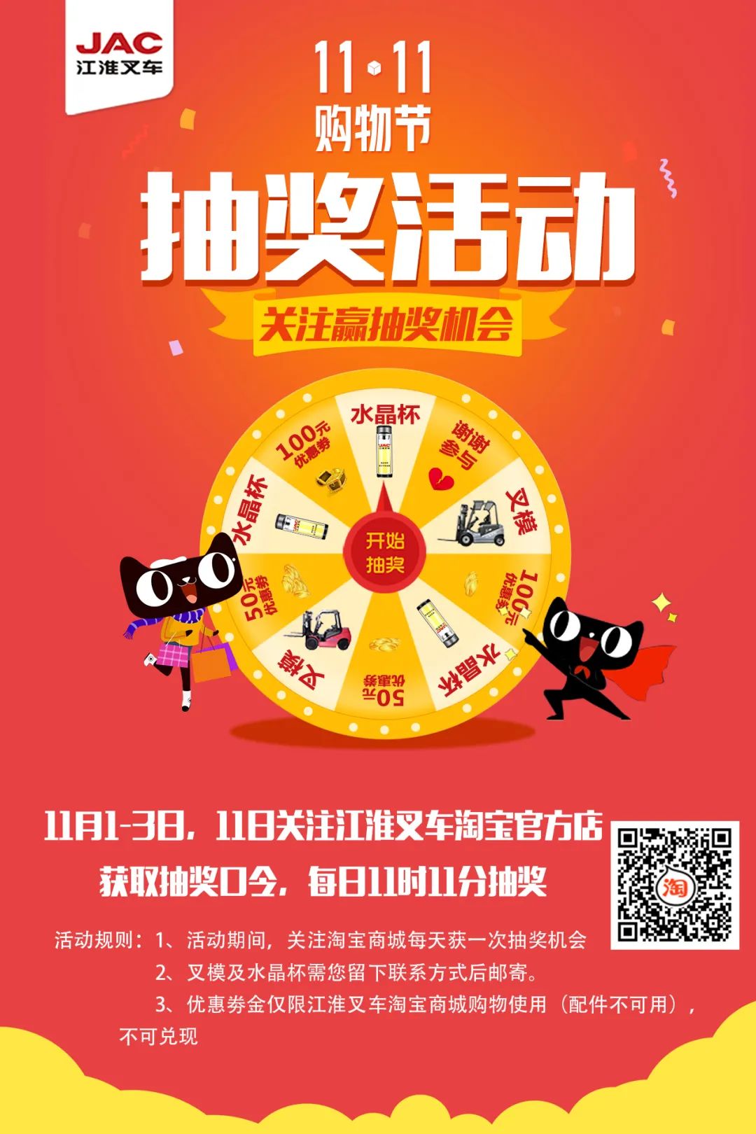 3、活动4天每天关注江淮叉车淘宝,可参与微信抽奖,奖品298元叉车模型,99元水晶杯,100元-50元淘宝购物优惠劵免费抽取;