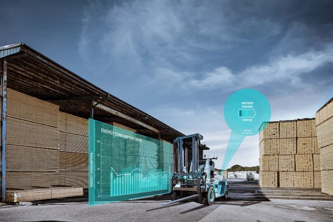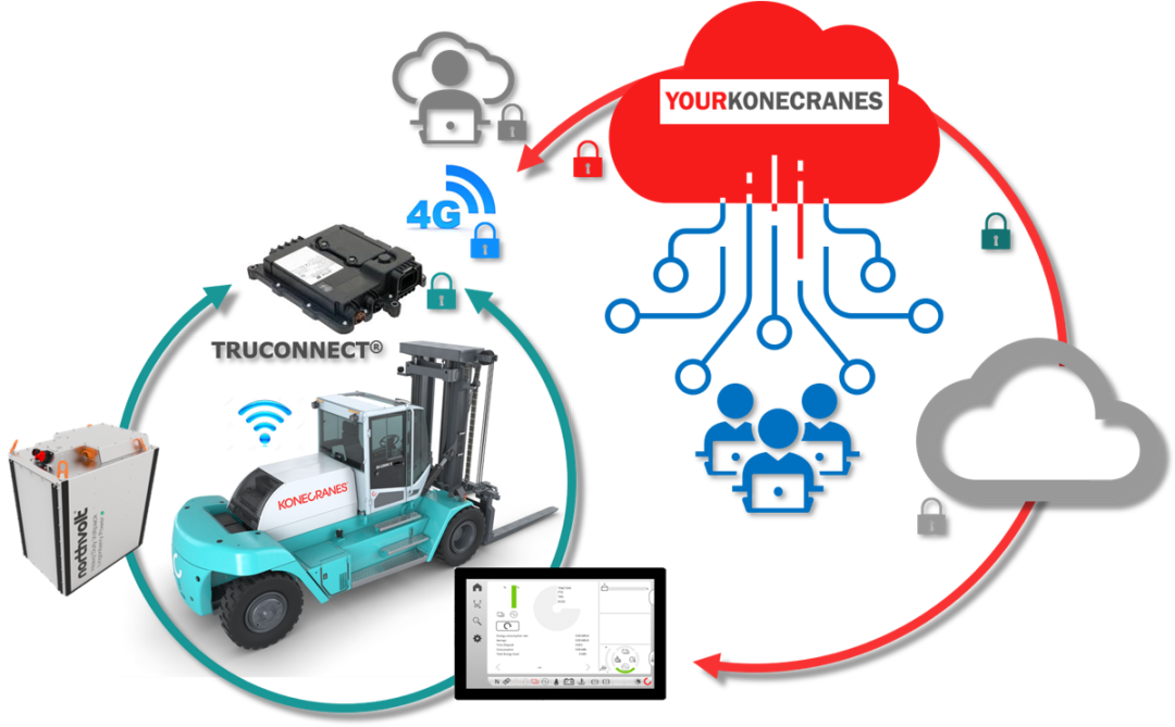 科尼E-VER同时是一款智能叉车。TRUCONNECT®远程监控跟踪电池充电状态以及能量消耗和回收。yourKONECRANES.com客户门户网站将所有这些信息集中于一体,提供管理和运营KPI以及数据可视化和趋势图,以监控设备的运营效率、生产率、安全性和环境影响。新的物联网平台旨在支持叉车与所有设备之间的通信,这意味着从设备和其可以与之交互的任何系统直接传输数据,并以最高级别的数据安全和网络安全为后盾。此外,物联网平台使监控、控制和分析客户的叉车车队和优化其运营变得更加容易。