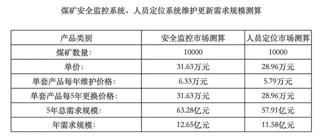 按照安监总局的要求,单套产品每年投入价格的20%进行维护,每5年更新一次,全国一共10000家将安全监控系统和人员定位系统的维护及替换需求做出估算。