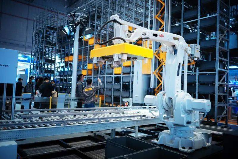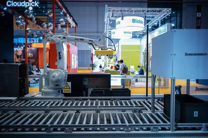 料箱从堆垛机上取下后,就会被机械臂抓取放置到传送带上。机械臂来自ABB,而黄色的部分是根据料箱尺寸定制的抓手,这个流程可以充分体现企业全系统解决方案中的集成能力。