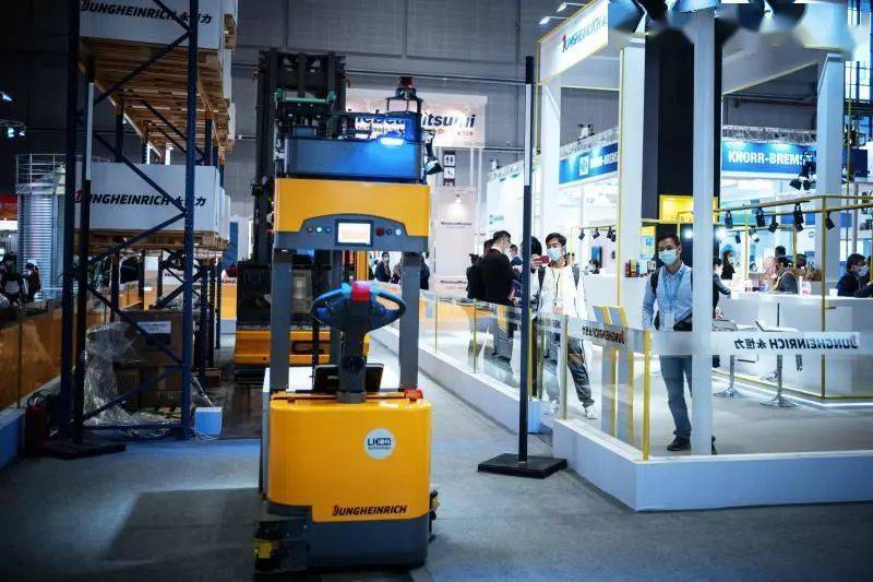被传递到输送带尽头的料箱,会被一台自动导航叉车取走,送到下一个仓储点。这台设备是今年企业在进博会的首发产品,可以实现全自动无人驾驶。