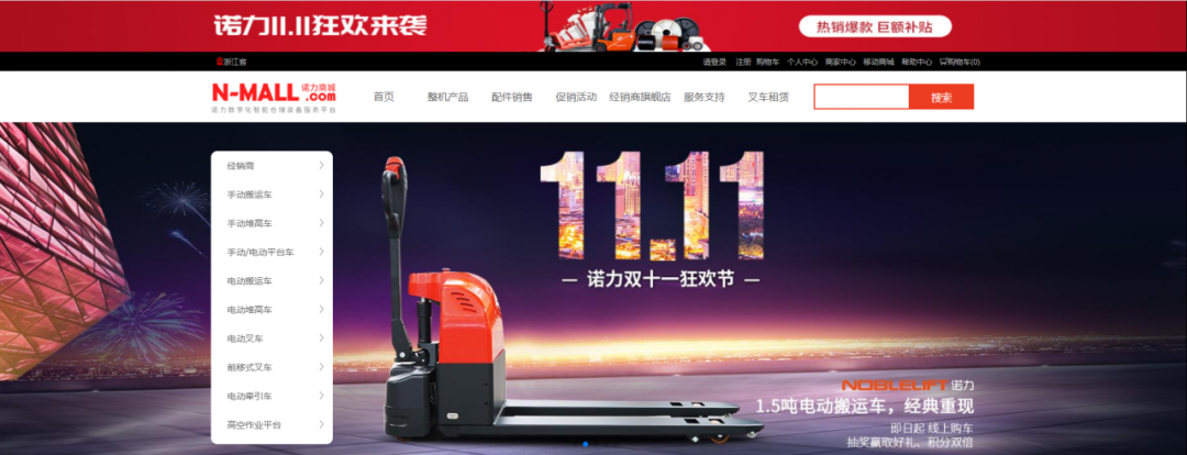 2020年11月11日,诺力股份旗下电商平台n-mall.com诺力商城首次上线试运行,当天就取得了EPT15步行式电动搬运车订购量17222台的战果。