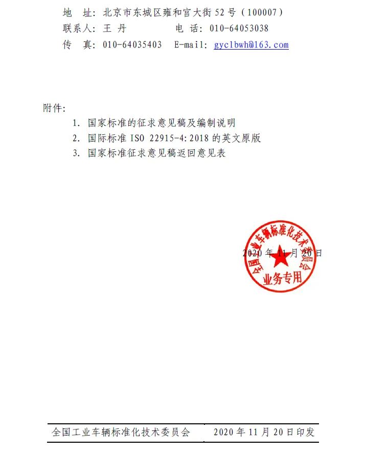 根据国家标准化管理委员会文件国标委发〔2020〕6号文“关于下达2020年推荐性国家标准计划(修订)的通知”的要求,由杭叉集团股份有限公司和北京起重运输机械设计研究院有限公司负责修订国家标准《工业车辆 稳定性验证 第4部分:托盘堆垛车、双层堆垛车和操作者位置起升高度不大于1200mm的拣选车》(计划编号20200542-T-604,等同转化ISO 22915-4:2018)。按照标准制修订程序的要求,已完成该标准征求意见稿。现将该标准的征求意见稿及编制说明发送全国工业车辆标准化技术委员会全体委员及有关单位广泛征求意见,请将回复意见和建议填入“征求意见稿返回意见表”。工业车辆标委会委员可在“征求意见稿返回意见表”上签名;其他单位均加盖公章,并于2021年1月19日前寄往(传真至)或E-mail至全国工业车辆标准化技术委员会秘书处。如无意见亦应予以回函告知,逾期不复函者按无异议处理。具体联系方式如下: