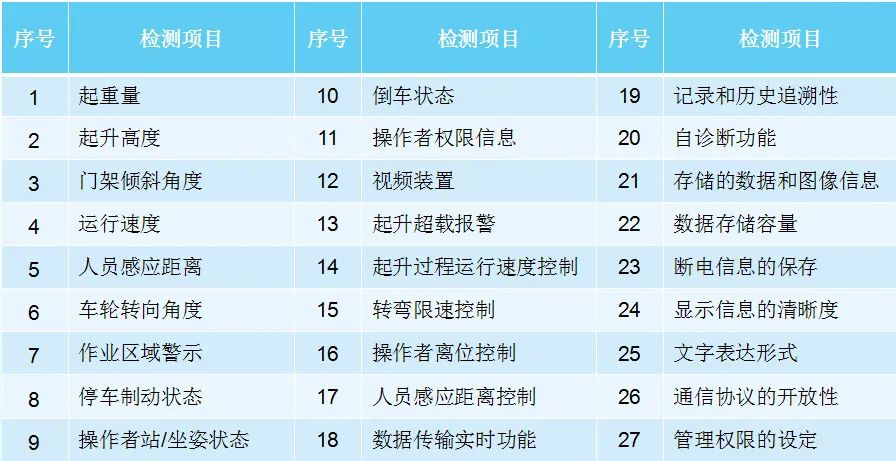标准中对如下27个检验项目规定了检验方法,并以表格形式给出了每个检验项目对应的要求要和方法的条款编号: