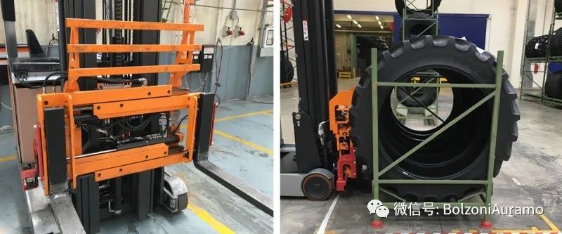 安装在前移式叉车上,这种调距叉提供比叉车框架更宽的张臂范围。在这里调距叉被用于搬运装有完工轮胎的容器(堆装架)。