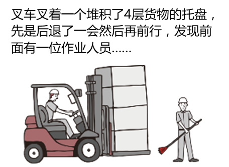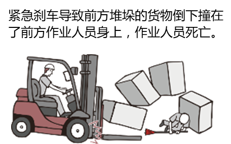 发现前方作业人员之后紧急刹车。叉车在紧急前行・紧急停车・急转弯时容易导致货物跌落。