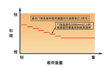 限制车速功能帮助管理者更彻底的进行车速管理,降低因误操作引起的车辆翻倒等重大事故的可能性。其中,防止急速启动功能可以感应货叉提升高度和载荷重量,防止急速启动。