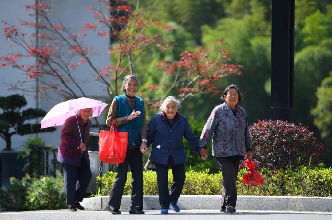 10月24日,长兴县煤山镇新川村,88岁的张如英(右二)在邻居搀扶下去村里的居家养老照料中心吃饭。为了让村里的空巢老人、残疾老人得到照顾,村里建立了居家养老照料中心,让老人老有所养、老有所乐。