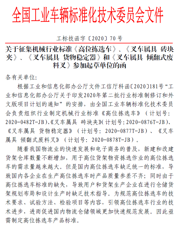 根据工业和信息化部办公厅文件工信厅科函〔2020〕181号“工业和信息化部办公厅关于印发2020年第二批行业标准制修订和外文版项目计划的通知”的安排,由全国工业车辆标准化技术委员会负责组织行业制定机械行业标准《高位拣选车》(计划号:2020-0482T-JB)、《叉车属具 砖块夹》(计划号:2020-0876T-JB)、《叉车属具货物稳定器》(计划号:2020-0877T-JB)、《叉车属具 倾翻式废料叉》(计划号:2020-0878T-JB)。