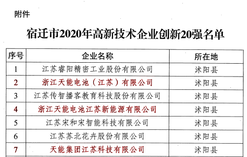 ❂【沭阳公司】为深入实施创新驱动发展战略,进一步激发高新技术企业自主创新能力,近日,宿迁市科技局开展了首次“宿迁市2020年高新技术企业创新20强”评选工作,浙江天能电池(江苏)有限公司、浙江天能电池江苏新能源有限公司、天能集团江苏科技有限公司光荣上榜,分别位居榜单第2位、第4位、第7位。此次评选是基于2019年底有效期内336家高新技术企业,按照创新投入、创新产出、创新绩效三个方面十个指标进行加权打分评出。