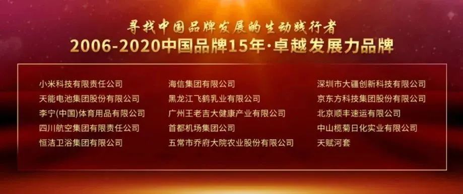 ❂【天能股份】12月20日,中国品牌创刊15年系列活动之一的“2006-2020寻找中国品牌发展的生动践行者”在北京举办。会上发布了中国品牌15年·卓越发展力品牌榜单,天能作为行业唯一品牌光荣上榜,与小米、大疆、王老吉、李宁、顺丰等各行领军品牌共享殊荣。