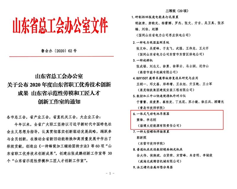 近日,2020年度山东省职工优秀技术创新成果评选结果公布,火炬能源公司职工窦锋、李志刚完成的《一体式气动电池吊装器》项目荣获二等奖。