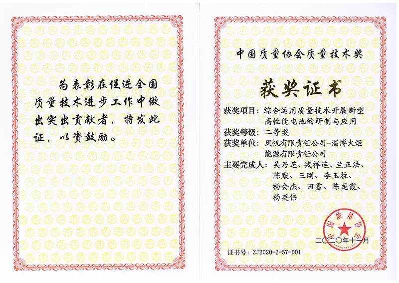 近日,从中国质量协会传来好消息,火炬能源公司推荐的质量技术成果——《综合运用质量技术开展新型高性能电池的研制与应用》,从全国721项参评成果中脱颖而出,荣获2020年度中国质量协会质量技术奖二等奖。