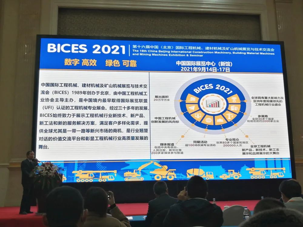中国工程机械工业协会副秘书长王金星在会上作《工程机械发展与“十四五”规划》发言,他分别介绍了工程写行业涉及范围,工程机械行业的现状,以及协会工作等。王金星讲话中重点介绍了协会工作及BICES 2021的筹备情况及工程机械科技创新成果展区工作安排,表示目前各项筹备工作进展顺利,展商报名好于上届,并诚邀与会代表们参展、参观明年的BICES展会,共同为工程机械行业高质量发展做贡献。