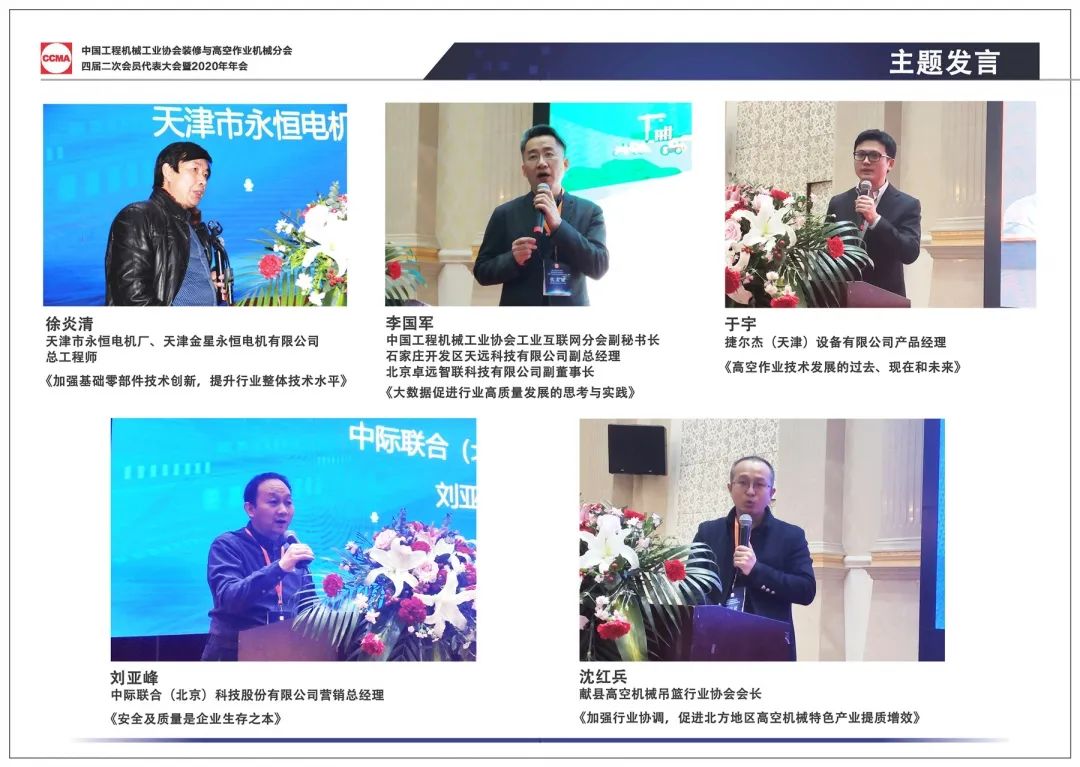 嘉宾主旨发言环节,天津市永恒电机厂总工徐炎清、中国工程机械工业协会工业互联网分会副秘书长、石家庄开发区天远科技有限公司副总经理李国军、捷尔杰(天津)设备有限公司产品经理于宇、中际联合(北京)科技股份有限公司营销总经理刘亚峰、献县高空机械吊篮行业协会会长沈红兵、北京凯博擦窗机械科技有限公司王进教授、徐州海伦哲专用车辆股份有限公司总经理尹亚平、无锡市小天鹅建筑机械有限公司董事长李石生、国家建筑工程质量监督检验中心扣件检测部温雪兵、大明国际控股有限公司工程服务部部长胡强等嘉宾,围绕着会议主题,分别作主旨发言。