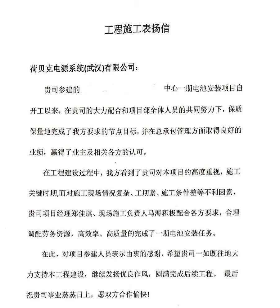 我们充分了解客户的应用场景,专门开发满足客户特定需求的解决方案,项目部员工各就其位、各司其职。在最短时间内整理供货清单,完成设计图纸、多方协调产品方案对接,在工期、产能等各方面的压力下与客户反复沟通,确保电池的顺利交货。现场服务工程师克服疫情、低温等种种困难,按时保质保量完成安装任务,受到用户积极肯定。客户的重点数据中心项目也成为我们新的里程碑,为后续进一步合作和大客户开发打下了坚实基础,让我们有更大的信心去攻破更难的项目。