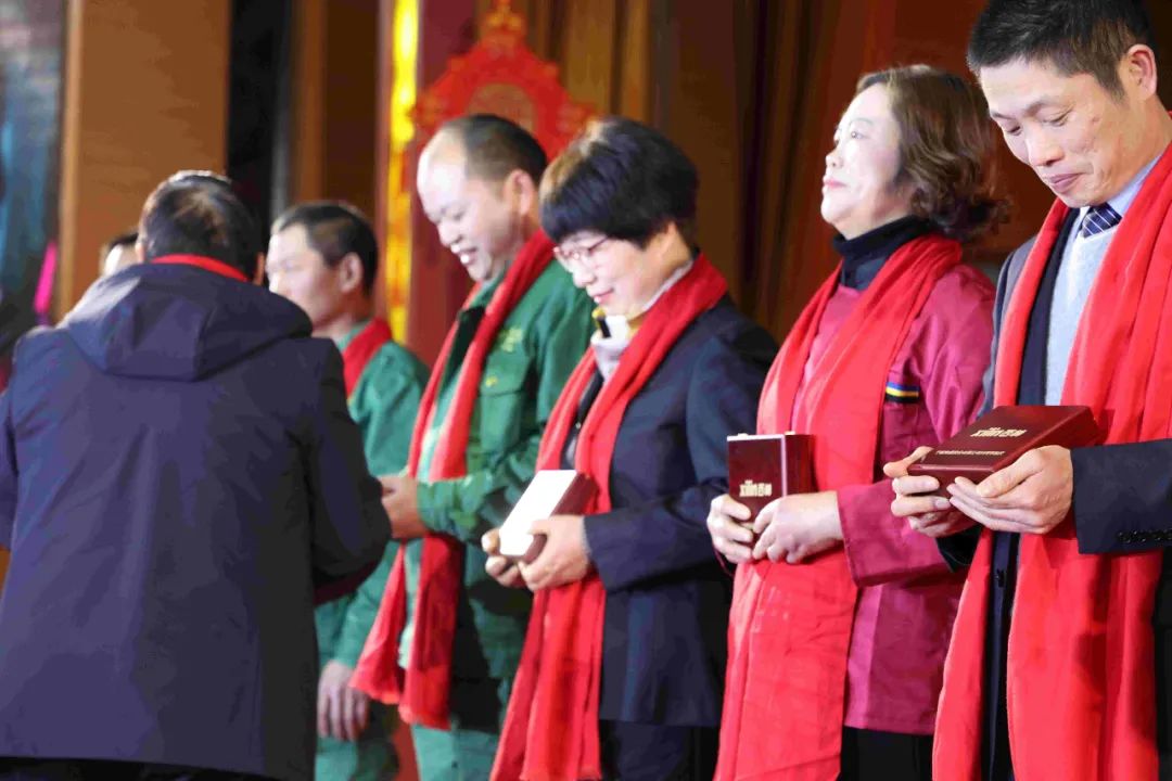 图为名誉董事长储吉旺给功勋员工颁发纪念金币
