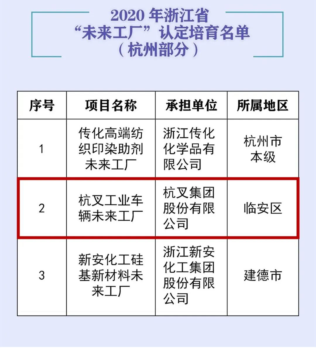 12月23日,浙江省首届“未来工厂”发布会上,认定12家未来工厂和16家“未来工厂”培育企业名单,其中杭叉集团股份有限公司的“杭叉工业车辆未来工厂”上榜“未来工厂”培育企业名单。