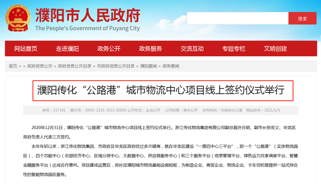 2020年的最后一天,12月31日濮阳传化“公路港”城市物流中心项目线上正式签约。