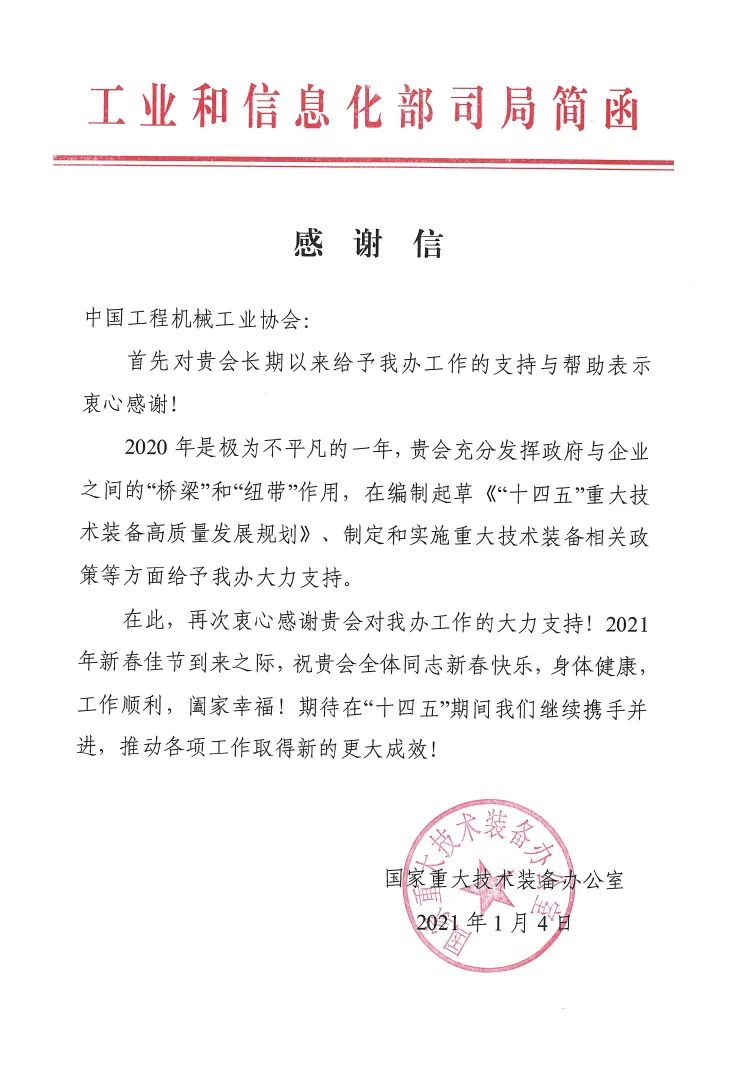 2021年1月4日,工信部致函中国工程机械工业协会(简称:协会),对协会充分发挥政府与企业之间的“桥梁”和“纽带”作用,在工信部编制起草《“十四五”重大技术装备高质量发展规划》、制定和实施重大技术装备相关政策等方面给予的大力支持表示感谢。以下为感谢信全文: