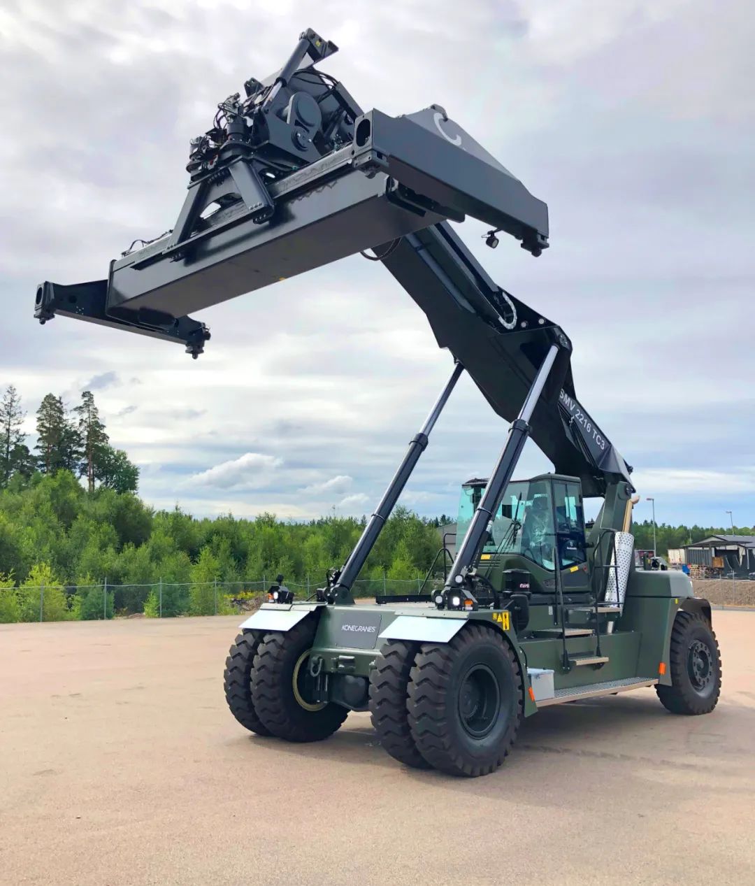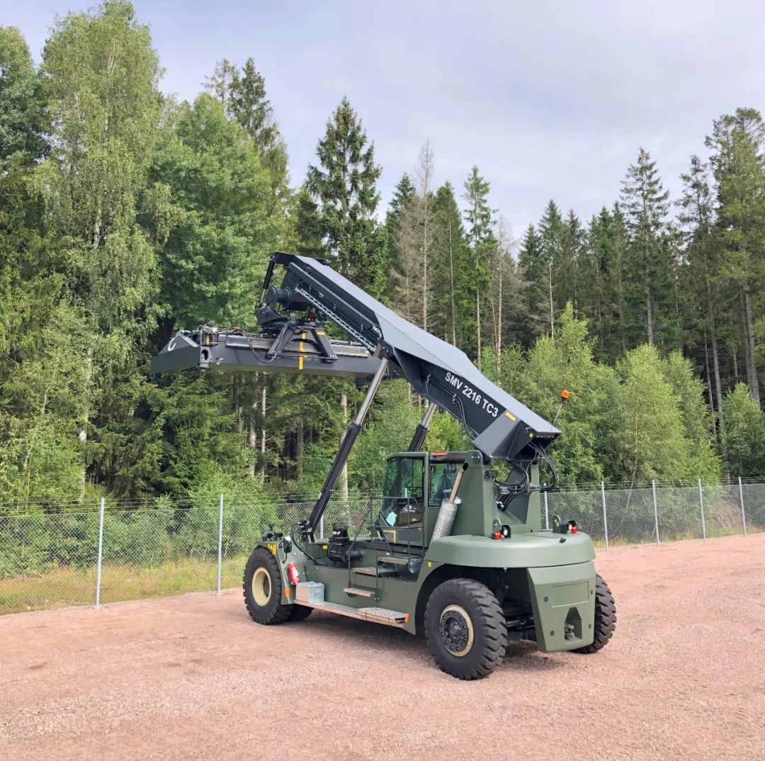 39台量身定制的科尼正面吊漆面为军绿色,轴距5500mm,第一排可起升22吨集装箱至3个集装箱高度,第二排和第三排起升能力分别为16吨和6吨。其他定制化功能包括:加装特殊车钩,以便帮助陷入不平坦路面的设备脱困;胎压监测帮助设备减少磨损、降低油耗及提升设备在恶劣环境中的安全性。为了切实确保驾驶安全,还按照联邦国防军的要求增加了额外的安全功能。