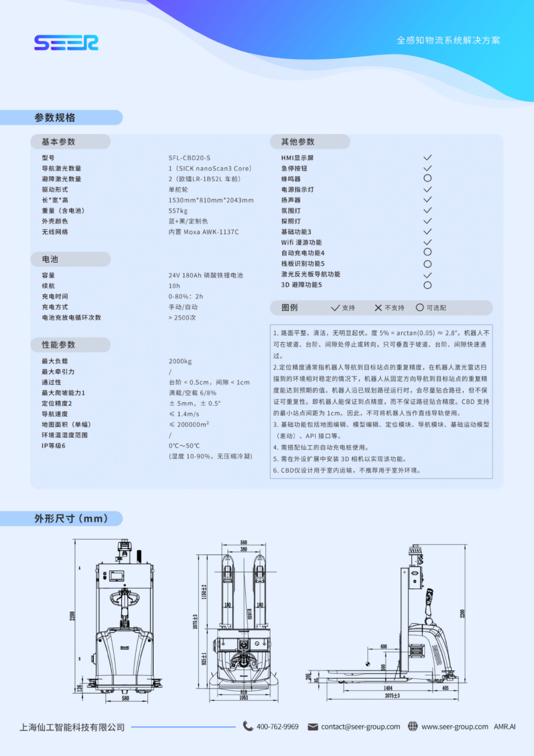 另附激光SLAM搬运式叉车SFL-CBD20-S的参数表,让您一览无余:
