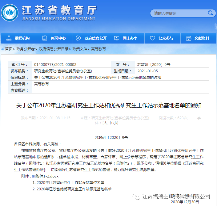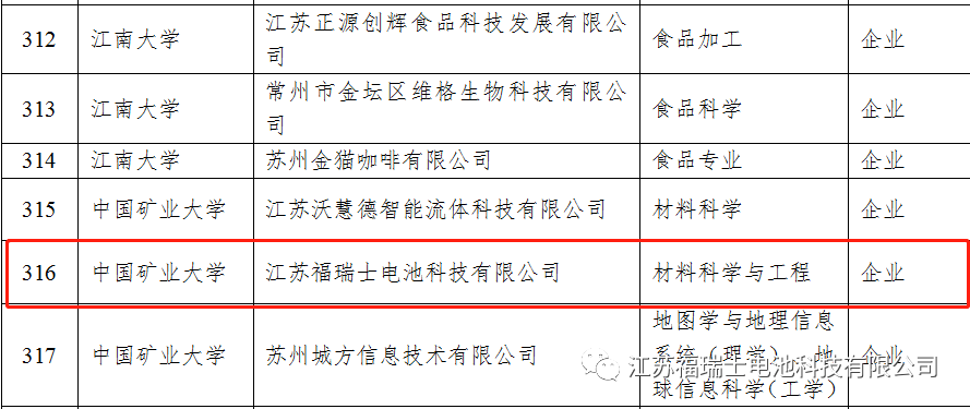 江苏省教育厅、江苏省科技厅公示了《2020年江苏省研究生工作站和江苏省优秀研究生工作站示范基地认定评审结果》的通知,江苏福瑞士电池科技有限公司与中国矿业大学联合申报的2020年“江苏省研究生工作站”获得评审通过。