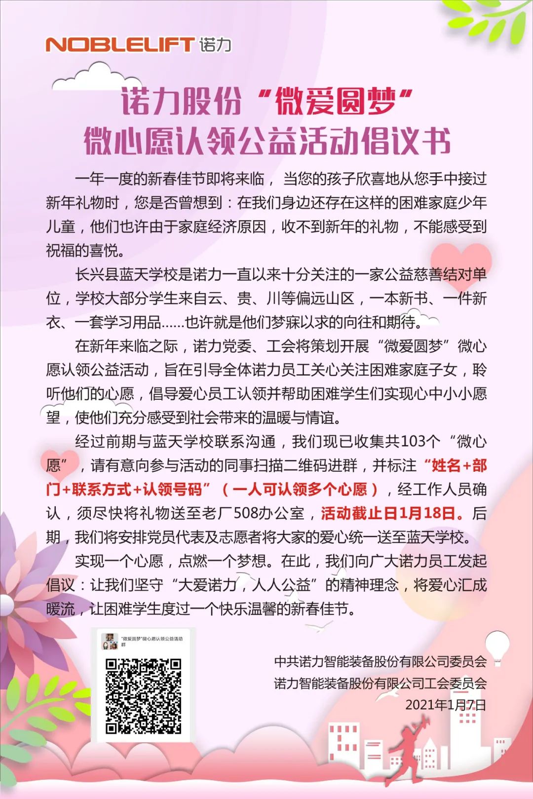 在新春佳节即将到来之际,诺力党委联合公司工会、团委、文明办等群团组织发起了“‘微’爱圆梦”微心愿认领公益活动——为蓝天学校103名困难学生准备新年礼物。