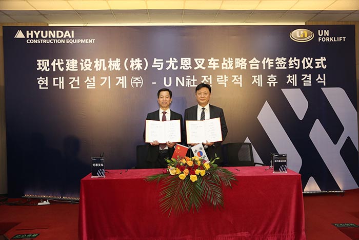 签约仪式在尤恩工厂顺利举行 ,新登镇党委书记俞一波、韩国现代建设机械总裁金相雄、CFO朴晋秀、尤恩叉车董事长吴金贤、尤恩叉车常务副总朱烈新等出席并发表致辞。吴金贤和金相雄代表双方企业签订战略合作协议。