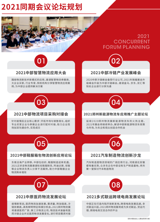 2021第八届郑州物流展同期举办第六届郑州冷链物流展、第二届郑州新能源物流车展,特设四大主题展区:物流技术装备、综合物流、冷链物流、新能源物流车,吸引优质展商前往中部市场展示、推广,满足以河南为中心的中部地区及长江以北区域的观展、采购、学习、交流的需要。