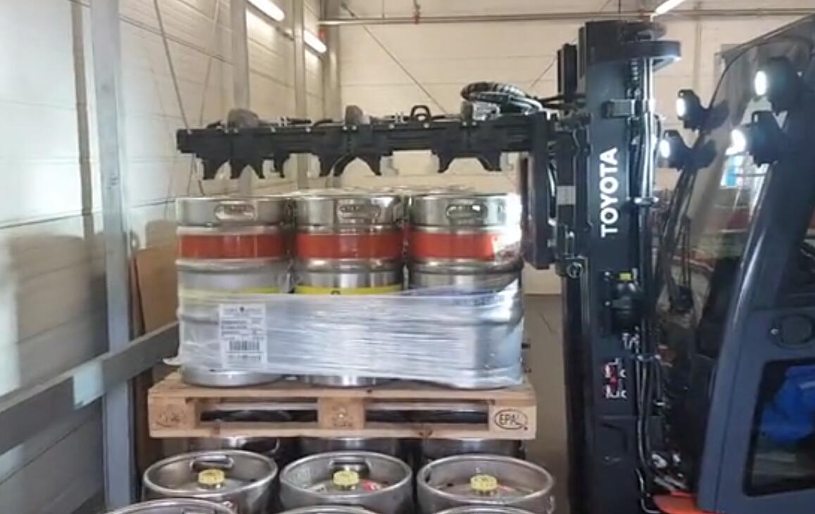 靠普(KAUP)开发了一种新型夹具0.5T099可以用来拾取可重复使用的小桶。0.5T099夹具(也称为啤酒桶夹具)的主要部件是展开装置,每个展开装置都有两个桶抓手。这些装置布置在吊杆上,该吊杆从上方降低到小桶上。一旦定位后,抓手就会伸展出来并拾起啤酒桶。在集装箱内,一辆丰田Traigo 48叉车驶至指定地点,放下小桶并松开抓手。另外,通过增加侧移行程2T151P-C的侧移器可加快该过程。这种侧移器的一个特殊功能是能够将其负载叉车轮廓移动到集装箱壁上。由于啤酒桶夹具的吊杆钩在侧移器上,因此也可以将啤酒桶直接放到集装箱壁上。