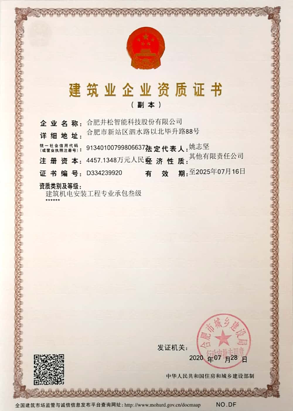 1、2020年7月,井松智能获得合肥市城乡建设局颁发的建筑业企业资质证书——建筑机电安装工程专业承包三级证书;