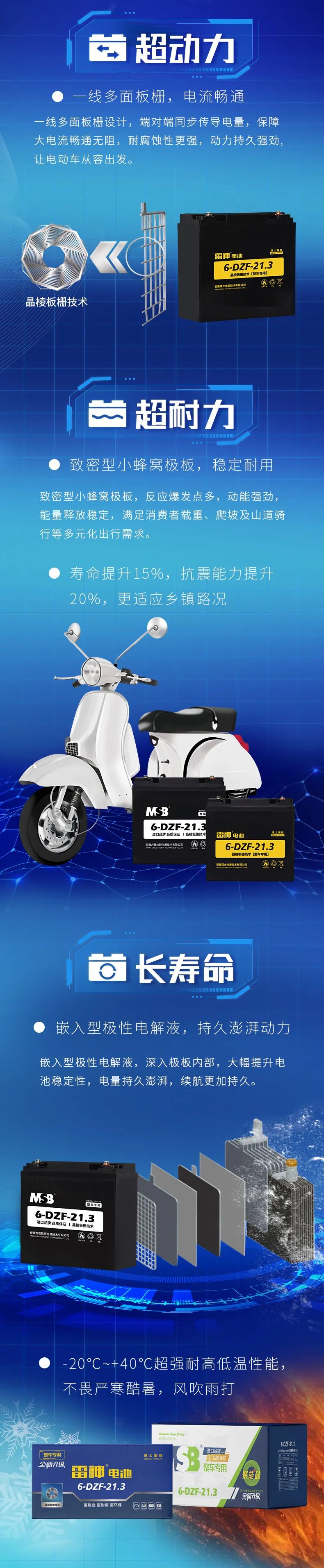 理士全新升级21.3电池汲取理士二十余年积累的生产经验和创新研发能力。从极板制作到电池组装,理士以初心去对待,用超国标的标准严格要求自己,保障每一只动力电池输出动能稳定。晶棱板栅技术,循环寿命提升15%,抗震性能提升20%,充电能力提升40%,-20℃~+40℃的超强耐高低温性能,让消费者品质出行更加安全高效。