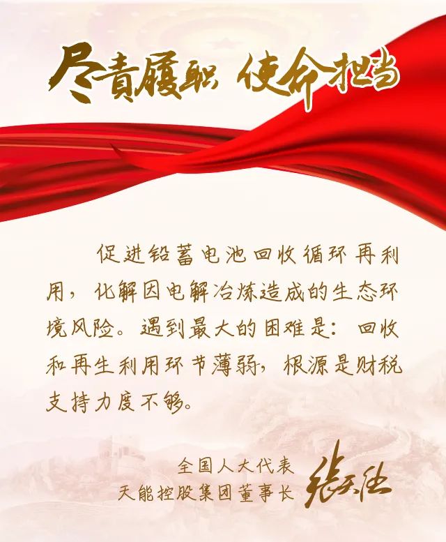 今年全国两会上,张天任代表围绕这一话题,再次提交了《关于进一步支持铅蓄电池产业发展循环经济,促进资源综合高效利用的建议》,呼吁国家从政策、税收上进一步支持铅蓄电池循环发展,鼓励资源循环利用,保障国家资源战略安全,推动生态文明建设。