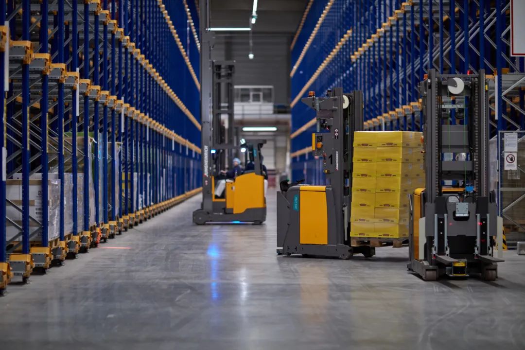 新仓库长130米,宽55米。在仓库的中央是一个长长的过道,其中有两辆EKS 215a自动导航叉车全自动完成运输托盘作业。