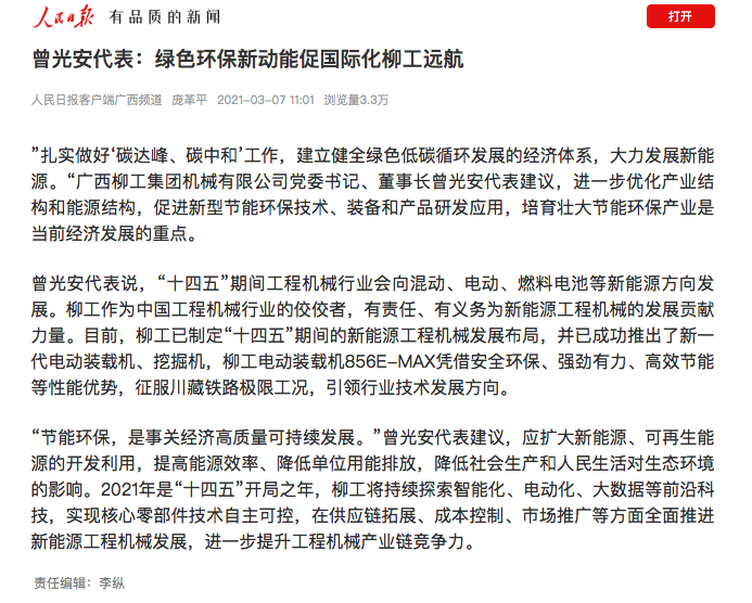 “节能环保,是事关经济高质量可持续发展。”曾光安代表建议,应扩大新能源、可再生能源的开发利用,提高能源效率、降低单位用能排放,降低社会生产和人民生活对生态环境的影响。2021年是“十四五”开局之年,柳工将持续探索智能化、电动化、大数据等前沿科技,实现核心零部件技术自主可控,在供应链拓展、成本控制、市场推广等方面全面推进新能源工程机械发展,进一步提升工程机械产业链竞争力。